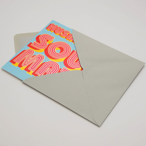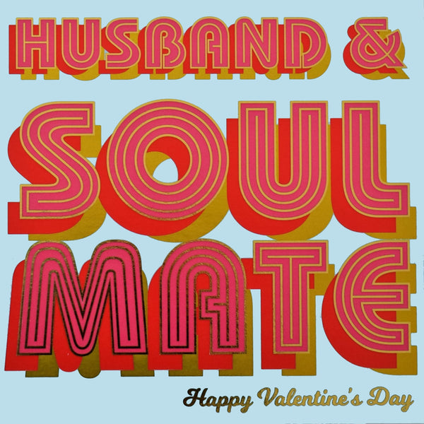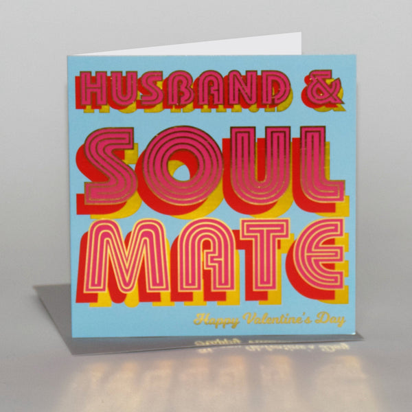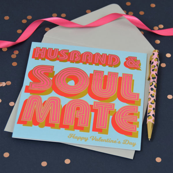 This beautiful vibrant foiled Valentine's Day Card for your amazing Husband who is your soul mate. From the Billboard range, and designed with bright, fun, bold text, and the writing is foiled in shiny gold. Printed on high quality board from sustainable sources with a grey envelope, and each comes in a biodegradable bag.