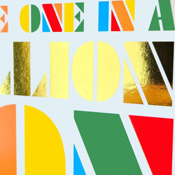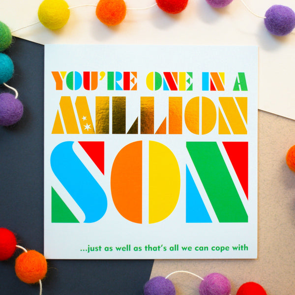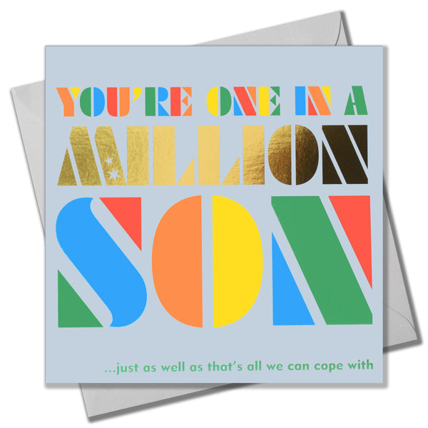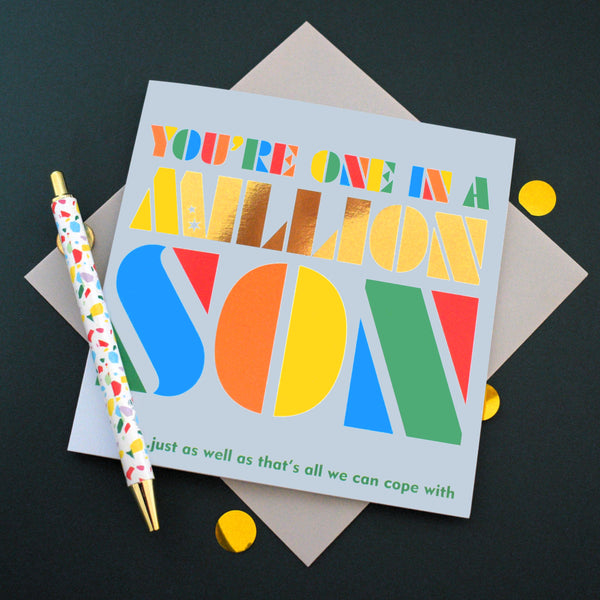 Birthday Card, Son, 1 In A Million, Colourful Block letters, gold foil