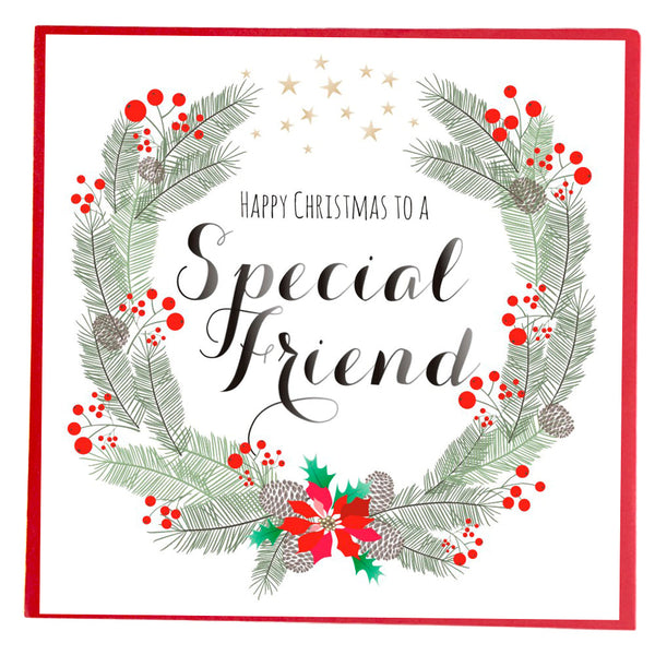 This beautiful card for a special friend has a wreath of fir cones and berries and a sprinkling of pale golden stars. The caption looks hand written and the matching card is a bright festive red.