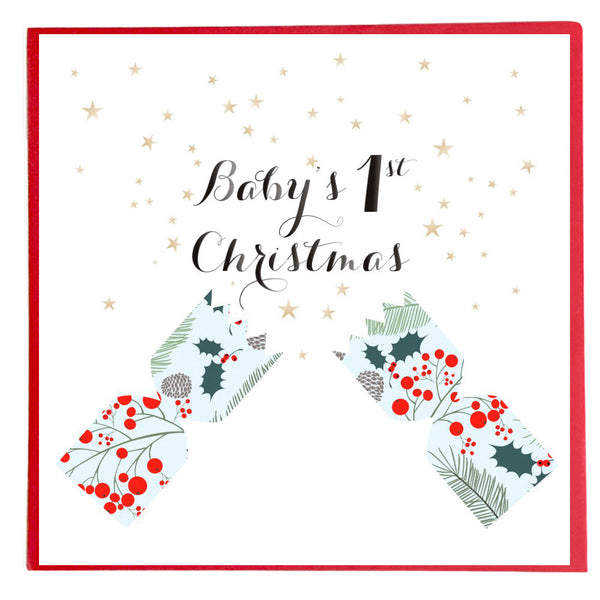 A patterned Christmas cracker of holly and bright red berries bursts open with a flurry of pale golden stars. The caption says 'Baby's 1st Christmas' and looks hand written. The card comes with a matching bright red envelope.