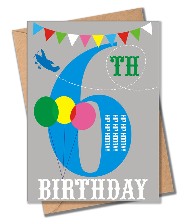 This cute brightly coloured card has bunting, balloons and an airplane and wishes a Happy 6th Birthday with a Hip Hip Hooray. The envelope contrasts nicely and is made of brown parcel paper.