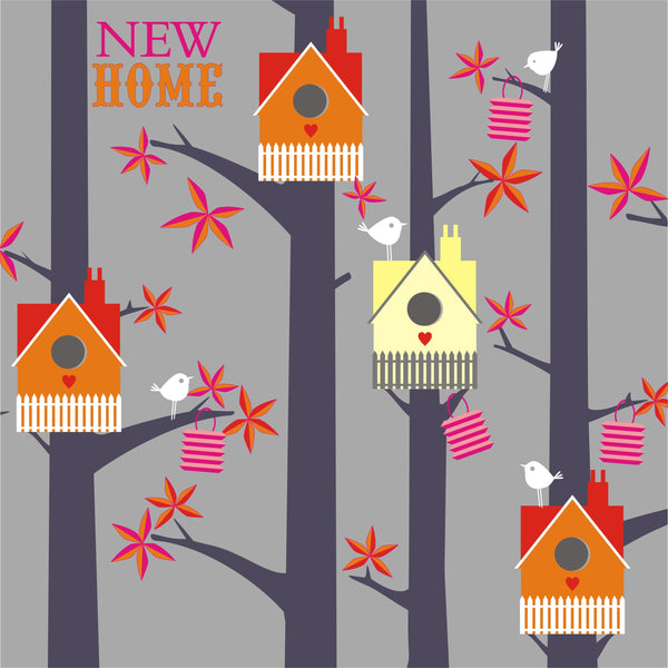 Set against a smart pale grey background, this card features little white birds setting up home. Cute orange and yellow bird boxes and lanterns hang from the trees and the caption 'New Home' is printed in the corner. The envelope is brown parcel paper and contrasts nicely.