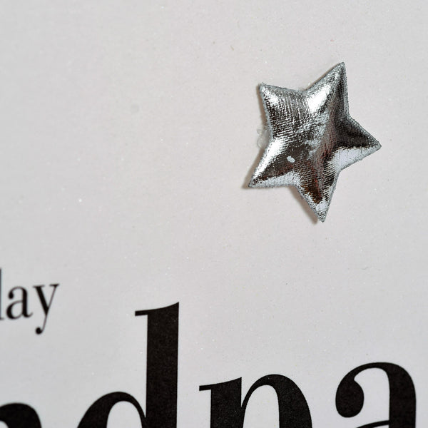 Printed on white card with a subtle shimmer, this range has large graphics and beautiful embellishments. 'Happy Birthday Grandpa' is printed with a patterned blue star and the card is embellished with a shiny padded silver star.