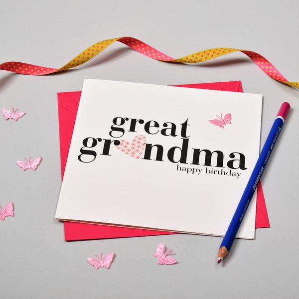 Birthday Card, Heart, Great Grandma happy birthday, fabric butterfly Embellished