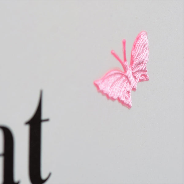 Printed on white card with a subtle shimmer, this range has large graphics and beautiful embellishments. 'Great Grandma happy birthday' is printed with patterned gold stars and the card is embellished with a fabric pink butterfly.