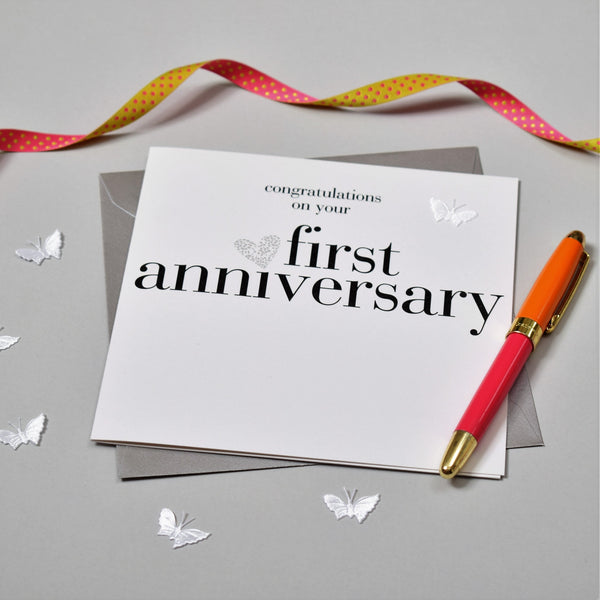 Printed on white card with a subtle shimmer, this range has large graphics and beautiful embellishments. 'Congratulations on your First anniversary' is printed with a patterned grey heart and the card is embellished with a white fabric butterfly.