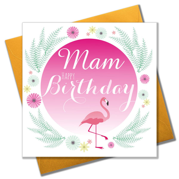 She's not my mum, she's my MAM, This beautiful, contemporary Birthday card from the Claire Giles range especially for Mam's. Designed with bright colourful floral background and pink flamingo image, and printed on high quality board from sustainable sources. Each comes with a gold envelope, and in a biodegradable bag.