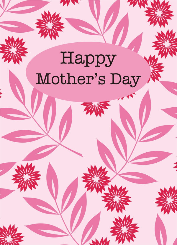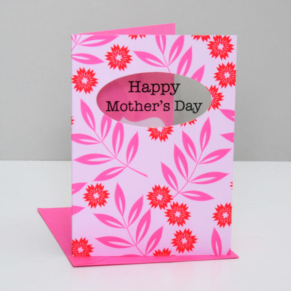 This traditional floral Mother's Day card is printed in shades of pink and coverd in flowers and leaves. The clear window is printed with 'Happy Mother's Day'. The card comes with a bright pink envelope.