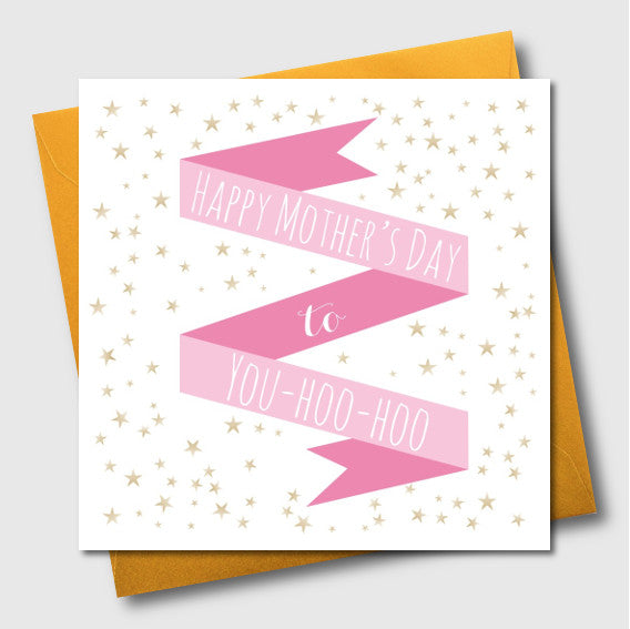 This modern card has a bright pink banner with modern white text set against a sea of golden stars. The shiny golden envelope complements perfectly.