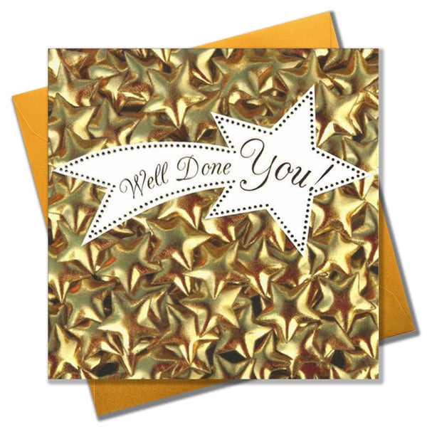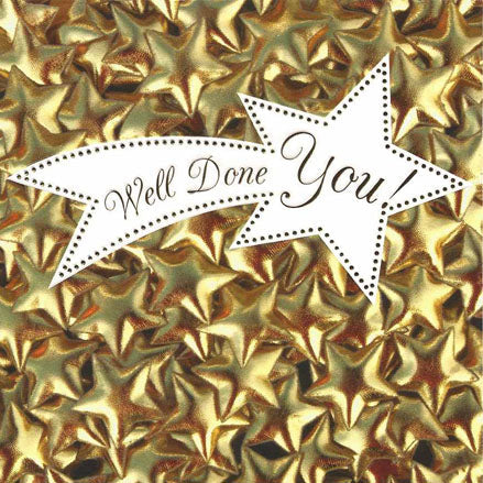 This congratulations card has hundreds of bright metallic golden stars and celebratory feel to it. 'Well Done You!' is printed against a white starry banner. The gold envelope matches perfectly.