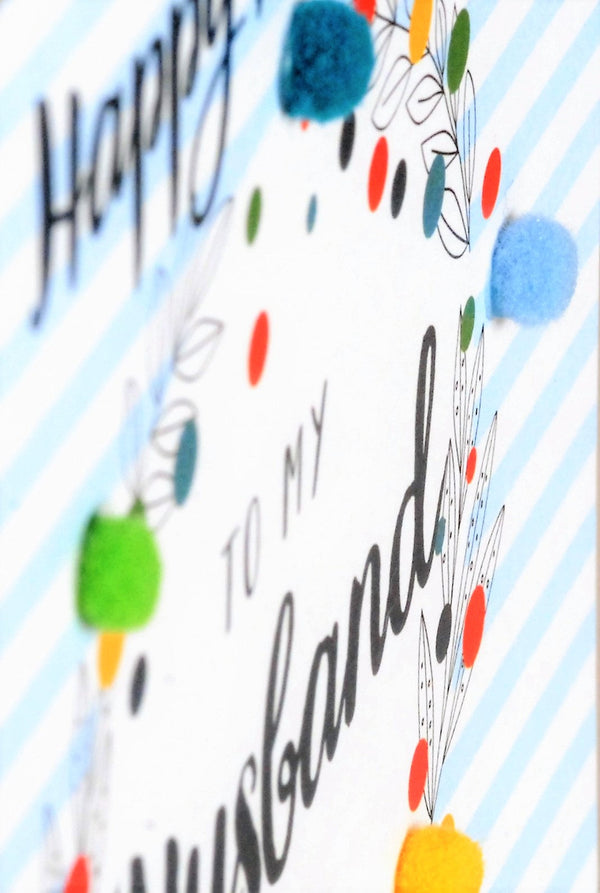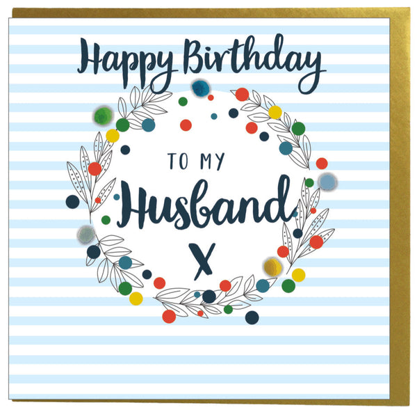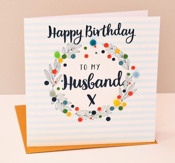 A fantastic modern greeting card to wish your wonderful Husband a very happy birthday. The card has a blue striped background with a colourful laurel and polka dot design. It is embellished with bright pompoms and printed on high quality white FSC accredited board with a bright gold envelope.