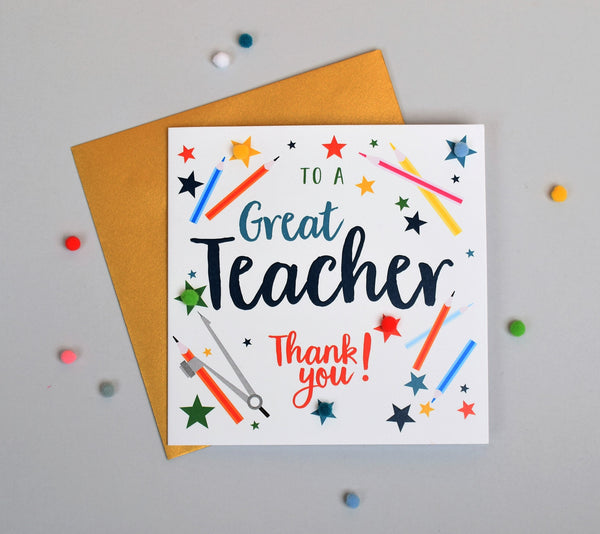 A beautiful bright card to deliver your Thanks to a Great Teacher. The card has a colourful stars and pencils background, and is embellished with bright coloured pompoms and printed on high quality white board with a shiny golden envelope.
