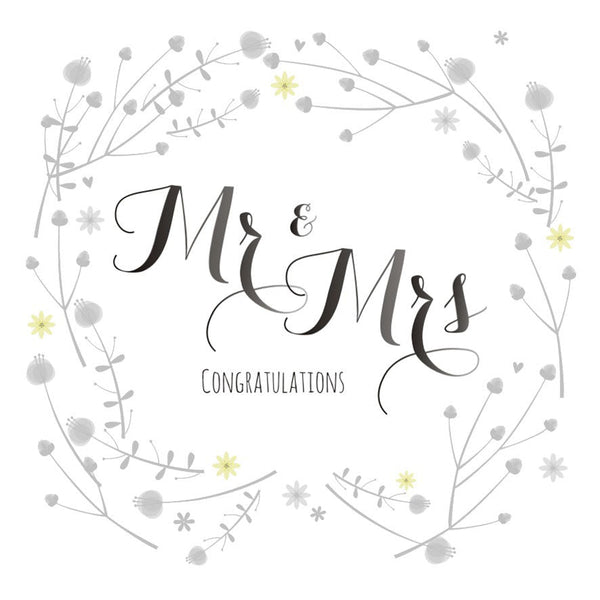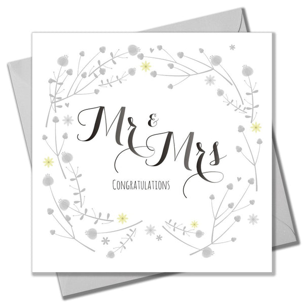 This elegant card has delicate floral and foliage swags in muted tones. 'Congratulations Mr & Mrs' looks beautifully hand written. It comes with a matching silver envelope.