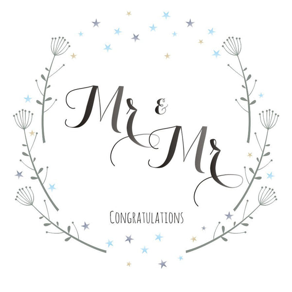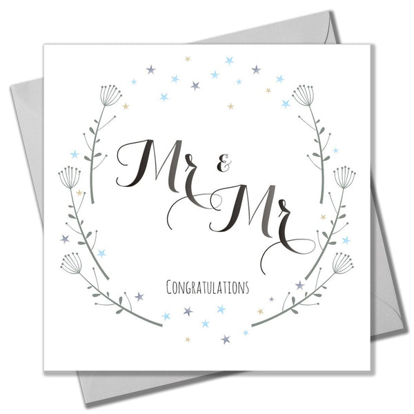 This elegant card has delicate swags of foliage and stars in greys and blues. 'Congratulations Mr & Mr' looks beautifully hand written. It comes with a matching silver envelope.