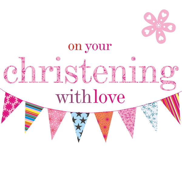 To celebrate the Christening of a special baby girl, this modern card is printed with a swag of coloured bunting, on high quality board from sustainable sources with bright matching envelope.