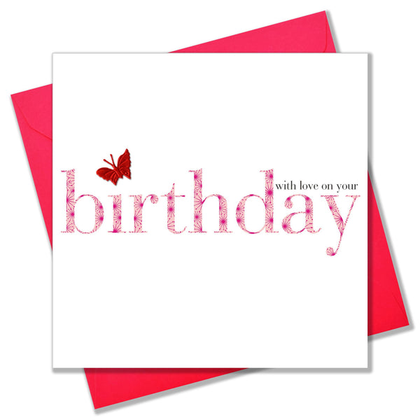 Birthday Card, Pink, With Love, embellished with a pretty fabric butterfly