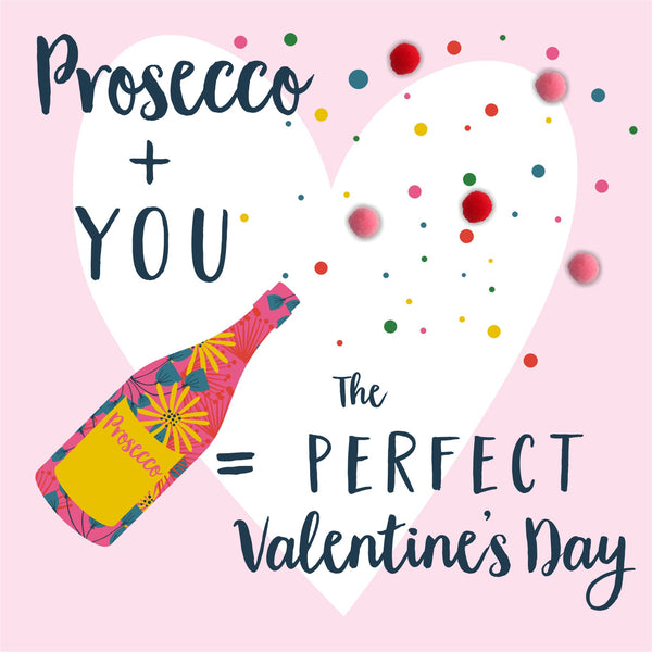 A beautiful bright Valentine's Day card with a popping bottle of fizz and the words 'Prosecco + You = the perfect Valentine's day'. Embellished with bright coloured pompoms and printed on high quality white board with a bright poppy red envelope.
