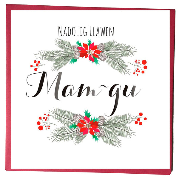 This elegant card has fir cones and bright red holly berries in a festive garland. 'Nadolig Llawen Mam-gu' looks hand written. It comes with a matching bright red envelope.