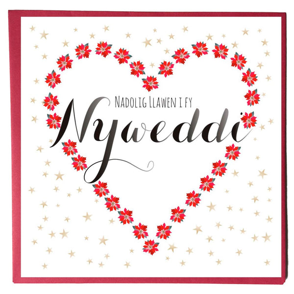 Welsh Christmas Card, Nadolig Llawen, Nyweddi, Fiancee, Poinsettias Heart