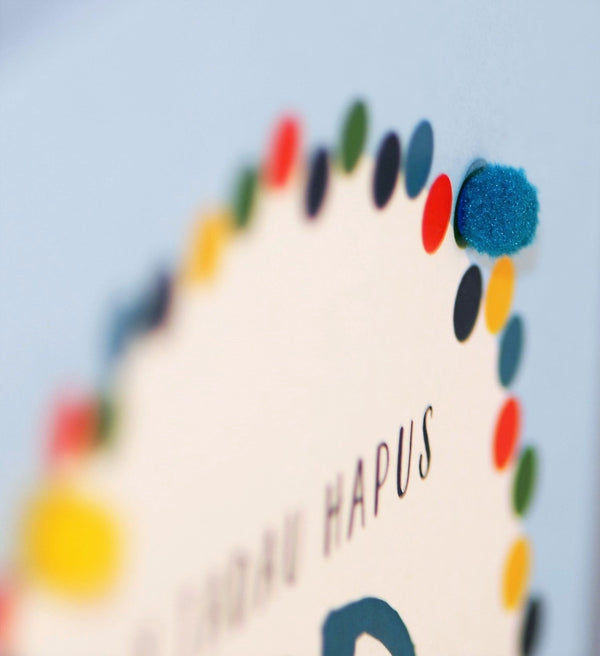 A beautiful bright Welsh language Father's Day card for your special 'Taid'. Embellished with bright coloured pompoms and printed on high quality white board with a shiny silver envelope.