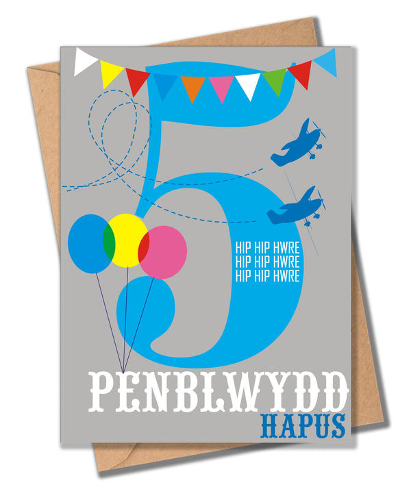 This cute brightly coloured card has bunting, balloons and circling airplanes and wishes a Happy 5th Birthday with a Hip Hip Hwre. It is printed with the caption 'Penblwydd Hapus' and a large '5'. The envelope contrasts nicely and is made of brown parcel paper.