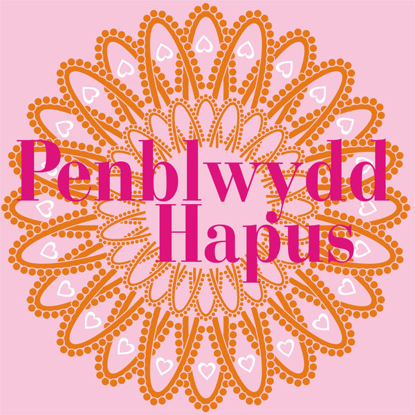 This modern symmetrical card has a brightly coloured lace design set against a delicate pale pink background. 'Penblwydd Hapus' is printed across the centre. The envelope contrasts nicely and is made of brown parcel paper.