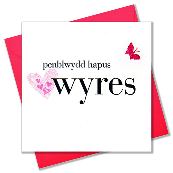 Printed on white card with a subtle shimmer, this range has large graphics and beautiful embellishments. 'Penblwydd Hapus Wyres' is printed with a patterned pink heart and the card is embellished with a pink fabric butterfly.