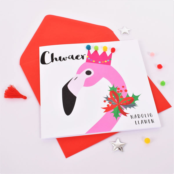 Welsh Sister Christmas Card, Nadolig Llawen Chwaer, Embellished with Pompoms