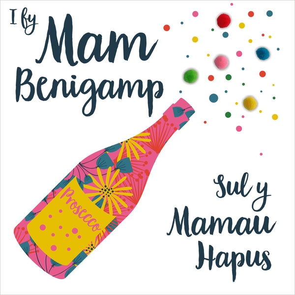 Welsh Mother's Day Card, Sul y Mamau Hapus, Prosecco Mum, Pompom Embellished