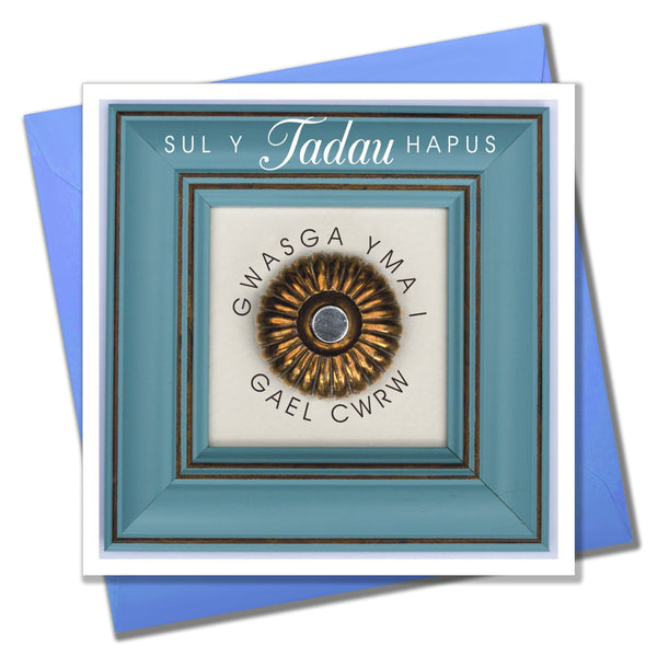 Dads usually love beer, especially on Father's Day. They'd probably never get up if there was a button they could push! The caption says 'Sul Y Tadau Hapus' - Happy Father's Day. This fun card comes with a bright blue envelope.