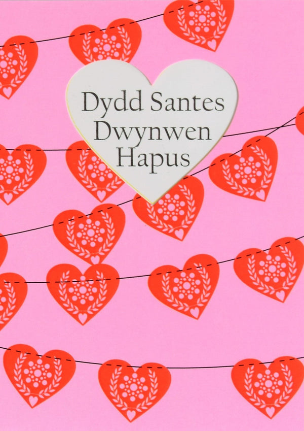 This elegant red and pink card is strewn with Valentine streamers. The message 'Dydd Santes Dwynwen Hapus' is printed on a clear window and the envelope is red to match.