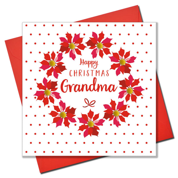 A beautiful modern Christmas card, with wonderful flowers against a polka dot background and the wording 'Happy Christmas Grandma'. Embellished with bright coloured pompoms and printed on high quality white board with a poppy red envelope.